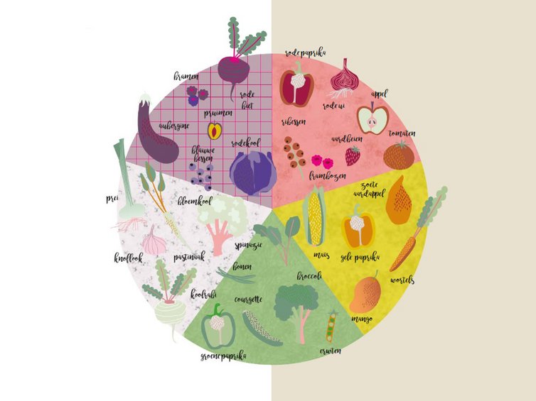 De vuistregel van de voedingsdeskundige is: eet elke week een regenboog! Dit betekent dat er verschillende soorten groenten en fruit op tafel moeten komen en dat u idealiter het hele kleurenspectrum moet eten. Afhankelijk van de kleur bevatten fruit en groenten verschillende voedingswaarden. Wanneer alle kleuren worden gegeten, zorgt dit voor een gebalanceerde mix van de waardevolle stoffen die de groenten en fruit bevatten. Kleurrijk eten zorgt niet alleen voor een visuele variatie op het bord, maar draagt ook bij aan een uitgebalanceerd eetpatroon.