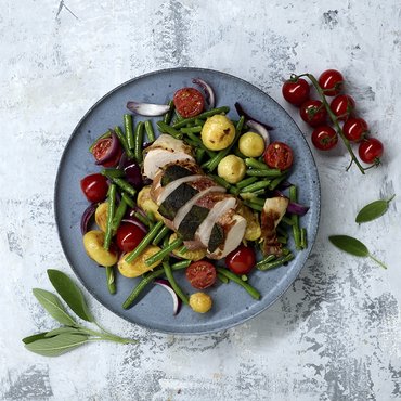 Leg de aardappelen in een met olie ingevette ovenschaal, bak in een voorverwarmde oven op 200 °C, ca. 28 minuten.