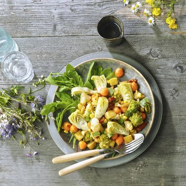 Heerlijke aardappelschotel met romanesco, Parijse worteltjes, uien, bloemkool, broccoli en voorgefrituurde aardappeltjes. Portioneerbaar.
