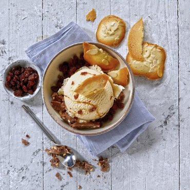 De karakteristieke smaak van Malaga-ijs ontstaat door in rum geweekte rozijnen. In combinatie met een intense saus met rumaroma biedt het ijs een bijzonder volle smaakbeleving. Of het nu puur wordt gegeten of samen met onze andere verfijnde ijssmaken, deze heerlijke specialiteit verwent zelfs de meest veeleisende fijnproevers.