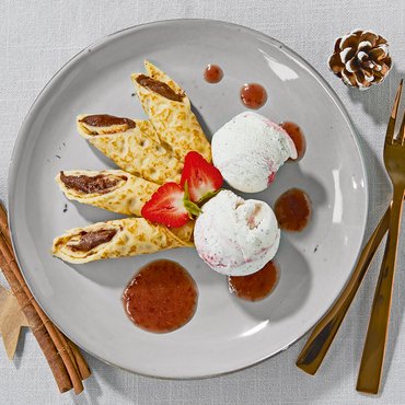 Gebackene Mini-Pfannkuchen gefüllt mit einer Nuss-Nougat-Creme (25%). Tiefgefroren.