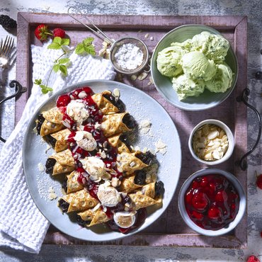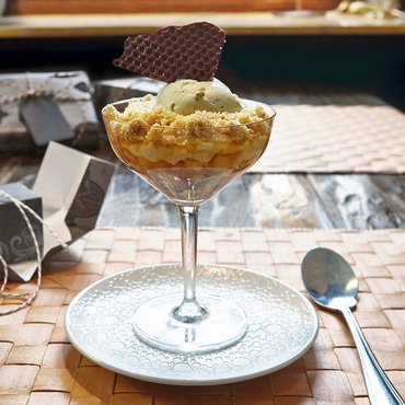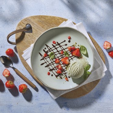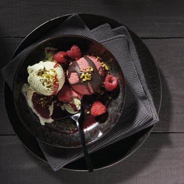 Romig pistache-ijs, met geroosterde en gehakte Californische pistachenten. Vol van smaak en nootachtig, perfect voor mooie ijscoupes, verfijnde desserts of als topping voor warme crêpes en taarten.