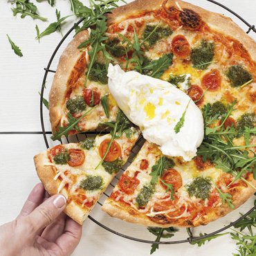 Een traditionele in de steenoven gebakken pizza belegd met een fruitige tomatensaus, aromatische cherrytomaatjes en toefjes basilicumsaus. Afgemaakt met mozzarella, Edammer kaas en Provolone.