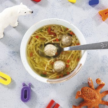 Sappige, fijn gekruide soepballetjes van rund- en varkensvlees. Voorgegaard. Lekker in onze tomatensoep.