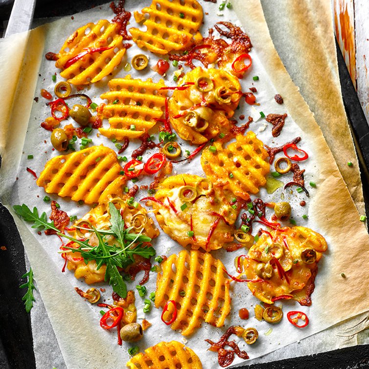 Knapperig geroosterde aardappelwafels met gegratineerde kaas is een heerlijke snack, maar ook een lekker pittig bijgerecht bij bijvoorbeeld een salade. Wij kunnen in ieder geval geen reden bedenken waarom u deze snack niet lekker zou vinden.