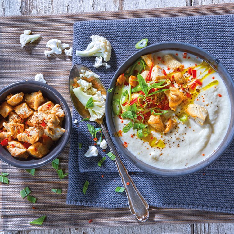 Bloemkool-crèmesoep met kip en chili