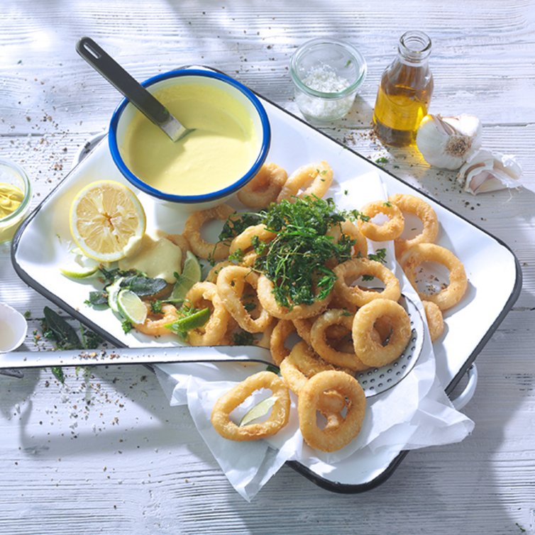 Calamari is een traditioneel mediterraans gerecht, gemaakt van inktvisringen. Door het heerlijke knapperige laagje beslag om de inktvis, is het ook een zeer populair gerecht bij kinderen. Serveer de calamares met kruiden, zeezout en aioli om lekker in te dippen.