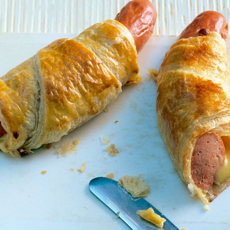 Rol het bladerdeeg om de knakworst en druk de randen goed aan.