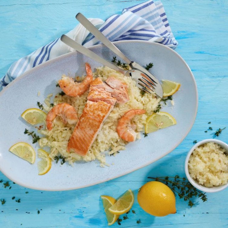Schik de risotto op de zijkant van het bord en leg de zalm met het vel naar beneden naast de risotto. Smelt de resterende boter in de pan waarin de zalm eerder werd gebakken en schep de garnalen er meerdere keren in tot ze gaar zijn. Leg op elke bord drie garnalen op de risotto en garneer het gerecht met vers geraspte Parmezaanse kaas en tijmblaadjes.
