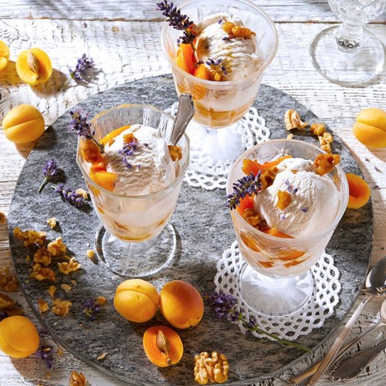 Schik nu de abrikozen, walnoten en twee bollen ijs in een glas of kom. Versier het geheel met lavendel.