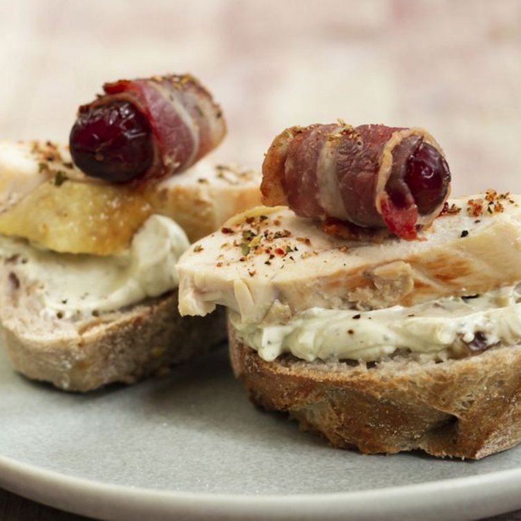 Bestrijk de sneetjes brood met de eerder gemaakte crème, leg de kipfiletreepjes erop en serveer met de in spek gewikkelde dadels.