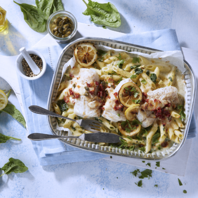 Bak het geheel in een voorverwarmde oven gedurende 25-35 minuten op 180 °C. Serveer de kabeljauwfilets samen met de penne en eet smakelijk!