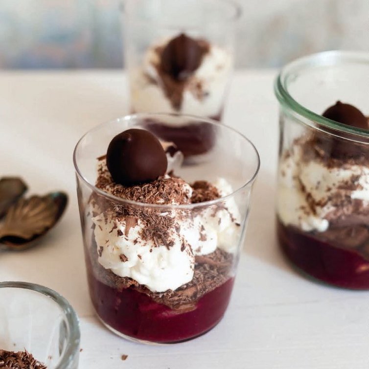 Vul de ijscoupes in lagen met het bessenpuree, de koekjes, het ijs en de helft van de chocoladekrullen.