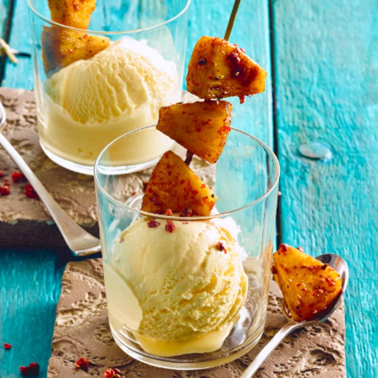 Rijg de ananasstukken op een spies en karamelliseer het fruit op de grill of in een pan. Kruid met rode of grove peper.