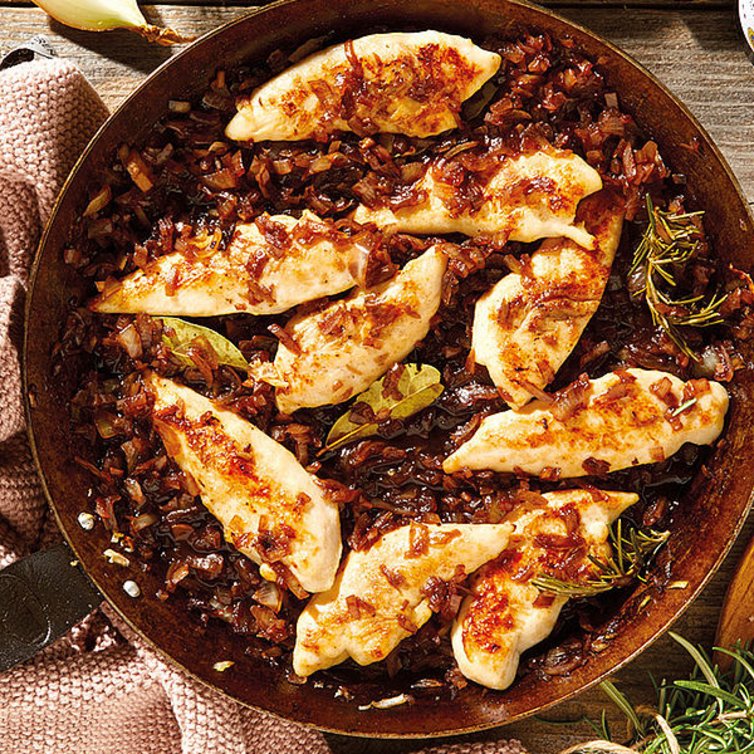 Gemarineerde kipfilethaasjes met balsamico-uitjes