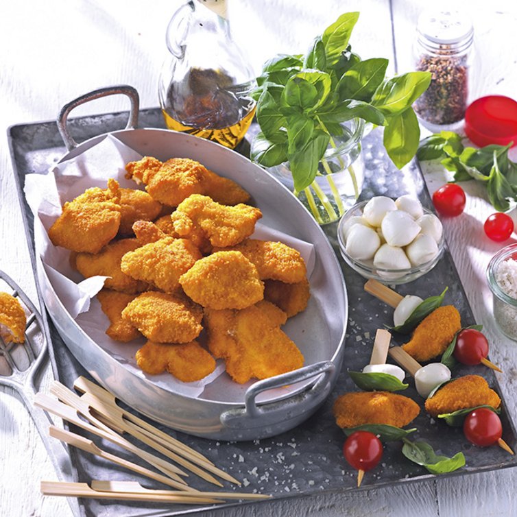 Haal de bevroren stukjes kip uit de verpakking en laat deze een aantal minuten ontdooien. Verwarm een beetje olie in een koekenpan en bak de stukjes kip ongeveer 8-10 minuten op middelhoog vuur. Draai de stukjes kip af en toe om tijdens de bereiding. Dep de stukjes kip even af met keukenpapier en laat het iets afkoelen.