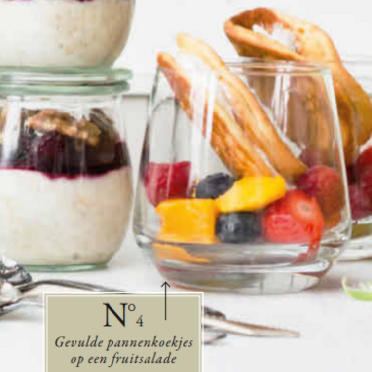 Maak van de ontdooide mangoblokjes, de vruchtenmix, een beetje honing en citroensap een fruitsalade en vul vier glazen hiermee halfvol.
