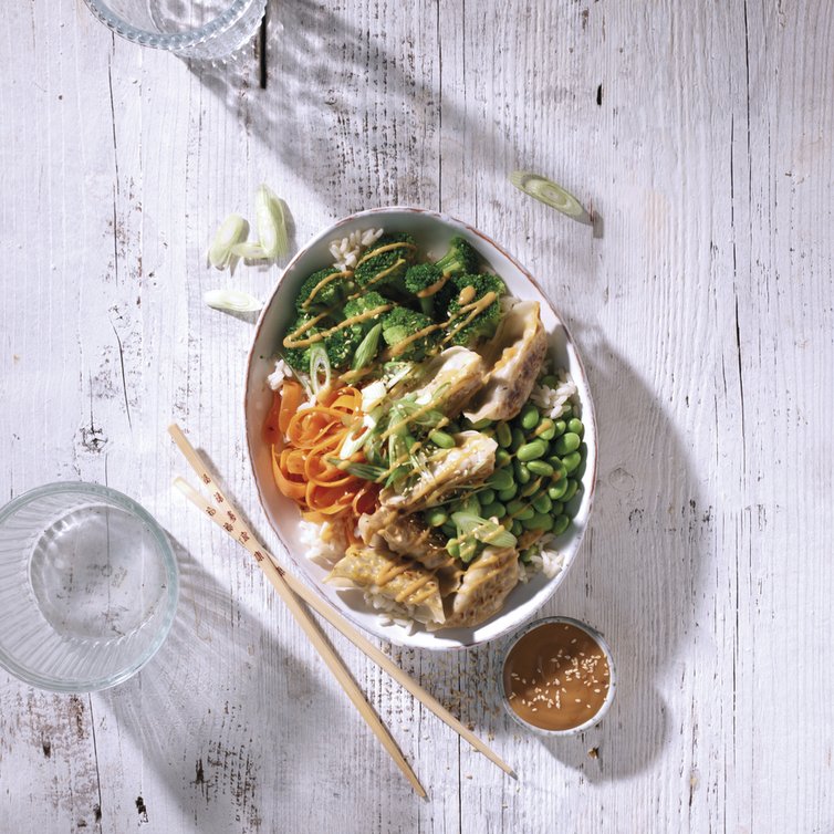 Verdeel de gekookte rijst gelijkmatig over 4 kommen. Voeg de gyoza, edamame, broccoliroosjes en geraspte wortelen in groepjes naast de rijst toe. Druppel de pindasaus over de ingrediënten en garneer de kommen met gehakte lente-uitjes en sesamzaadjes