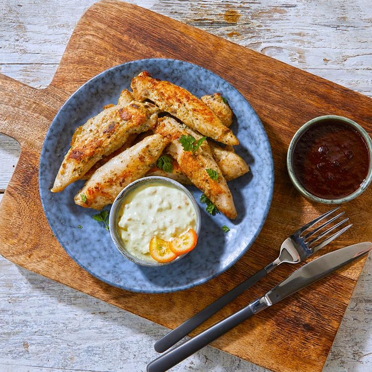 Serveer de kipfilethaasjes met de dips en een beetje chilipoeder.