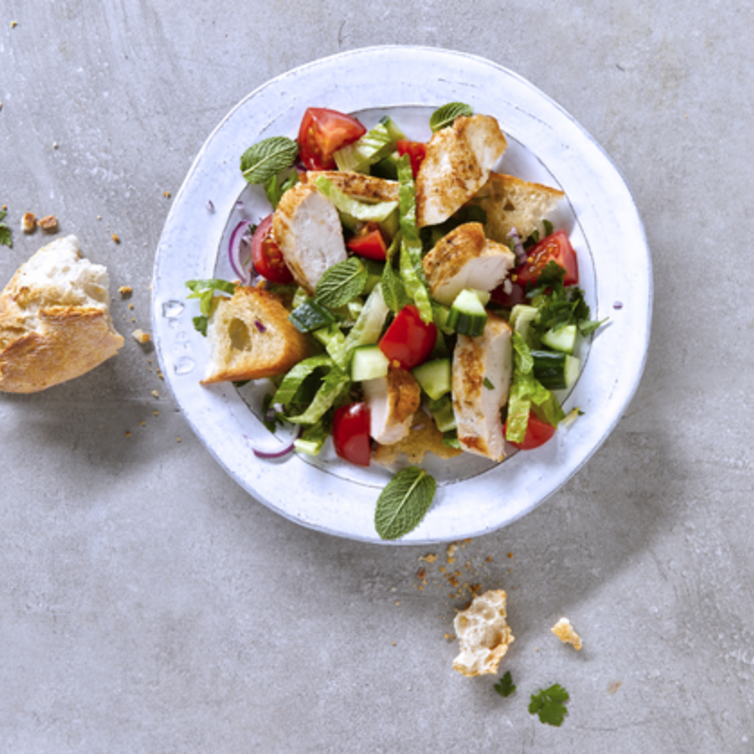 Voeg ondertussen de sla, tomaten, komkommer en peterselie toe aan de dressing en meng goed. Pas kort voor opdienen de sneetjes brood toevoegen.