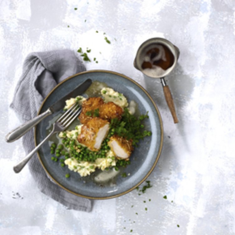 Een harmonieus contrast tussen de zachte en romige aardappelpuree, de knapperige doperwten en de smaakvolle mini-kipschnitzels.