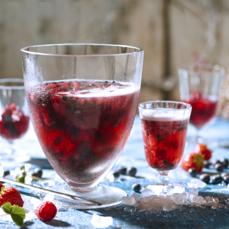 Vlak voor het serveren doet u de siroop, de resterende wijn en de resterende vruchten erbij. Roer alles voorzichtig door. Voeg mousserende wijn of mineraalwater toe en serveer direct.