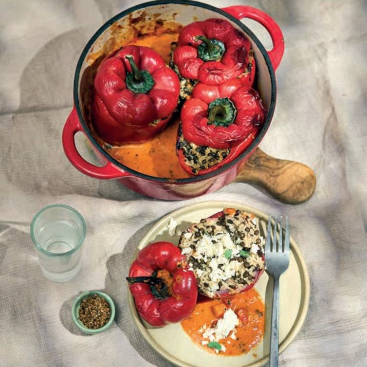 Verwarm de oven voor op 180 °C. Was de paprika's, snijd de uiteinden eraf en zet apart. Verwijder de zaadlijsten. Vul de paprika's tot de rand met het linzen-rijstmengsel en leg ze in een grote ovenschaal. Leg de afgesneden kapjes terug op de paprika's.