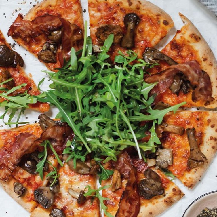 Was de rucola en dep deze droog. Top de pizza af met rucola, spekplakjes en gebakken paddenstoelen.