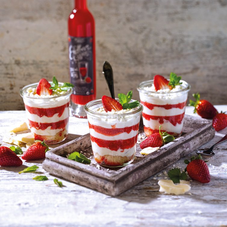 Doe de aardbeien, slagroomsoesjes en mascarponemix om en om in de glaasjes zodat er mooie lagen ontstaan. Eindig met een aardbei bovenop en eventueel een takje munt.