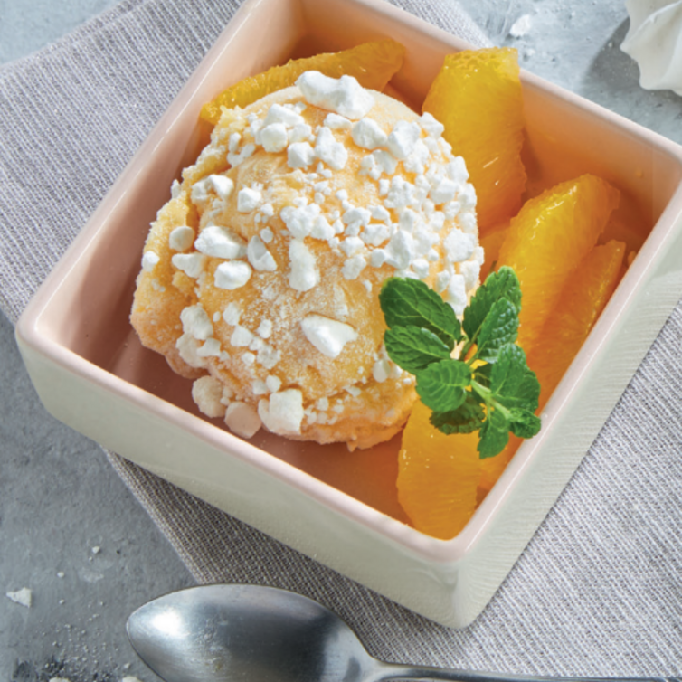 Serveer de bollen ijs in een mooie kom of glas, garneer met een blaadje munt en de sinaasappelschijfjes, smullen maar!