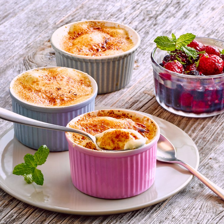 Heeft u wel eens een crème brûlée gemaakt? Het is vaak veel werk en lastig te maken. Probeer eens ons verleidelijk eenvoudige recept met romig vanille-ijs in plaats van room. Gekarameliseerd en afgemaakt met een frisse fruitcompote.