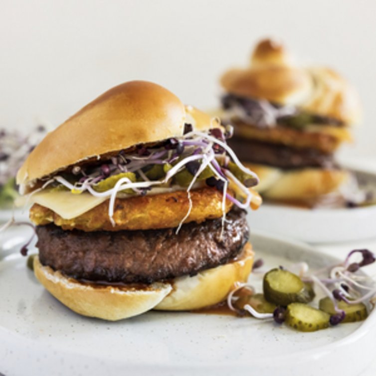 Smeer beide helften van de broodjes in met de saus. Leg de vega burger op de onderste helft, gevolgd door de röstischijf en kaas. Garneer het geheel met de augurkenplakjes en leg het kapje op de burger. Eet smakelijk!