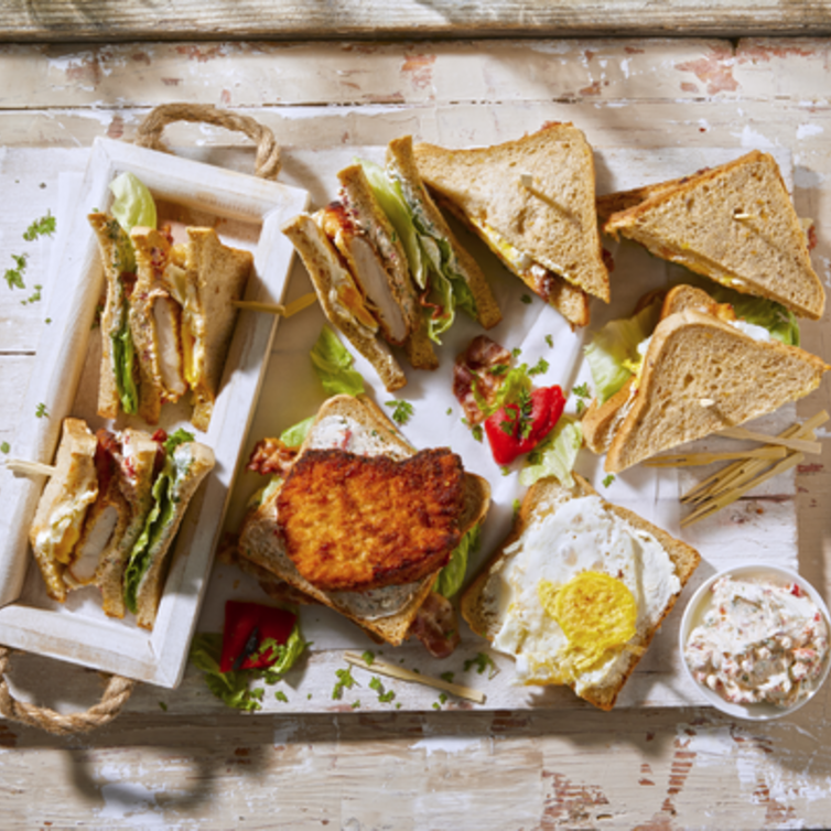 Bak de eieren in een pan met een beetje boter. Bereid daarna de sandwiches als volgt: toast met kruidenkaas, sla, bacon, toast met roomkaas met paprika, kipschnitzel, gebakken ei en bedek met een toast met roomkaas.