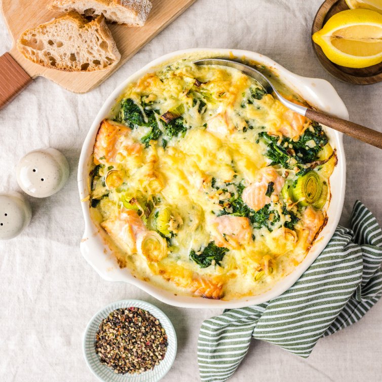 Een echt zondags gerecht: romige aardappelgratin met spinazie, prei en zalm. Een heerlijke combinatie van smaken dat een echte favoriet kan worden.