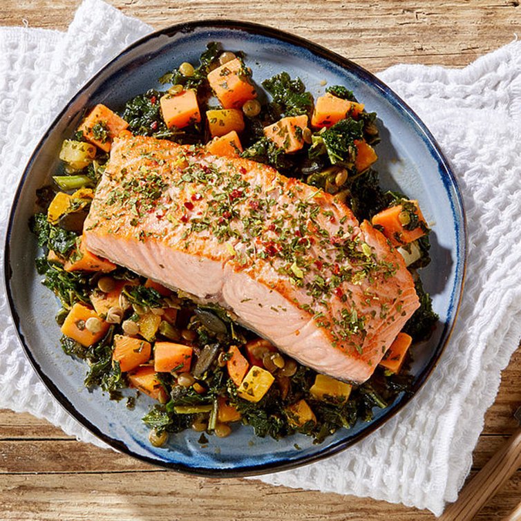 Zalmfilet op een bedje van zoete aardappel en boerenkool