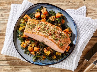 Zalmfilet op een bedje van zoete aardappel en boerenkool