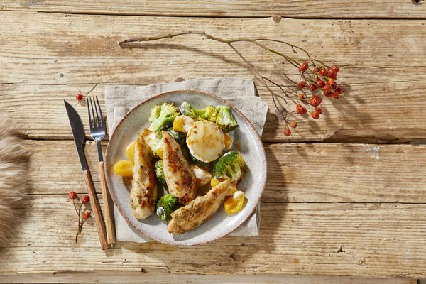 Malse kipfilethaasjes met broccoli, abrikozen en geitenkaas